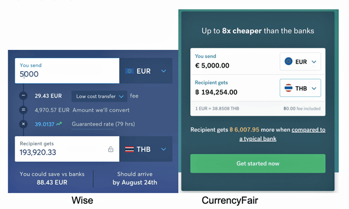 Aan de hand van dit voorbeeld [5.000 euro] is CurrencyFair [rechts] meer dan 250 baht goedkoper dan Wise [links]. Dat is 0,1% goedkoper.