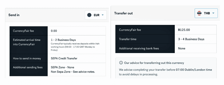 Voor het overmaken van euro’s naar je CurrencyFair rekening, ondersteunt CurrencyFair alleen een bankoverschrijving. Dit duurt 1-2 werkdagen. Vervolgens het geld overmaken door CurrencyFair naar je thaise baht rekening duurt 3-4 werkdagen. In totaal 4-6 werkdagen. Als je vandaag [zaterdag] begint met overmaken, heb je het geld op z’n vroegst donderdag einde dag.