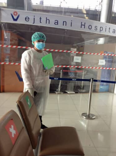 Gelukkig waren we al uitgebreid naar het toilet geweest. De non stop rit naar Pattaya duurde 2 uur. Deze taxichauffeur was er zich terdege van bewust ernstige patiënten te vervoeren. Plotseling remmen konden dodelijk zijn ook voor hem. Dan vlogen wij door de met plakband bevestigde plastic afscherming heen. Wij kwamen toch uit Nederland? Zwaar besmet gebied met heel veel doden.