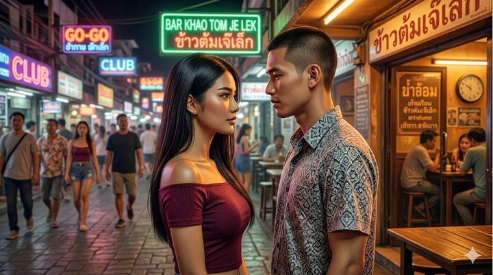 Hij had het niet van tevoren gezegd. Geen bericht, geen telefoontje. Gewoon ineens daar, in zijn beste shirt, met zijn haar netjes gekamt op de manier die hij deed als hij ergens naartoe ging wat hem nerveus maakte. Ik zag hem vanuit de bar staan kijken naar het bord boven de deur en ik wist meteen dat hij het was, ook al had ik hem nog nooit in Pattaya gezien. Hij paste er niet bij, niet op een slechte manier, gewoon op de manier waarop een monteur uit Udon Thani niet past op Walking Street, zoals ik er in het begin ook niet bij had gepast.