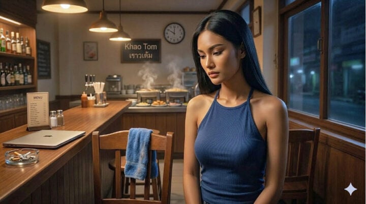 We zaten nog een tijdje zonder iets te zeggen. De ijsblokjes in onze glazen smolten langzaam. Buiten reed een tuk-tuk voorbij, te snel voor de smalle straat, zoals altijd.
