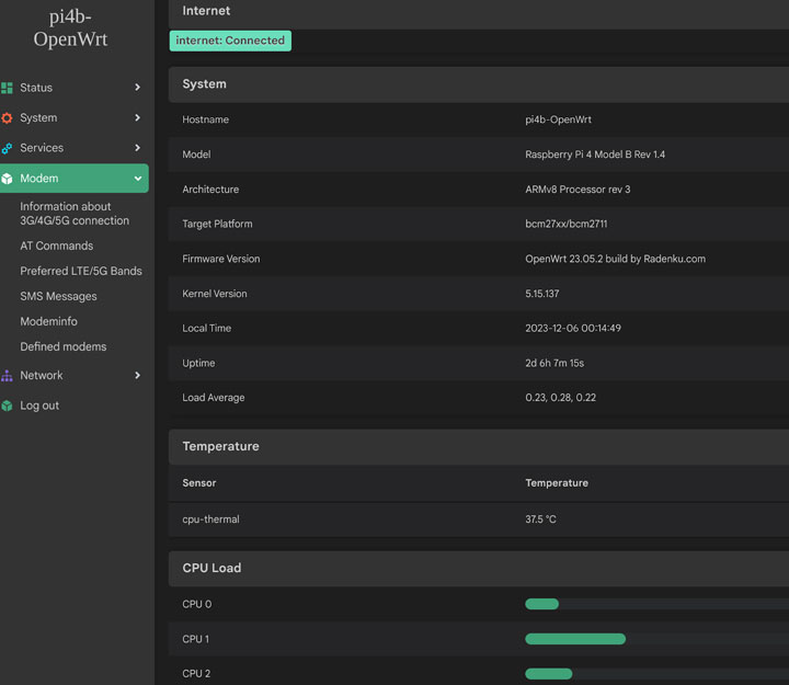 - een Raspberry Pi. Dit is een computer niet groter dan een creditcard. Op deze computer draait de router software OpenWrt, die de modem aanstuurt