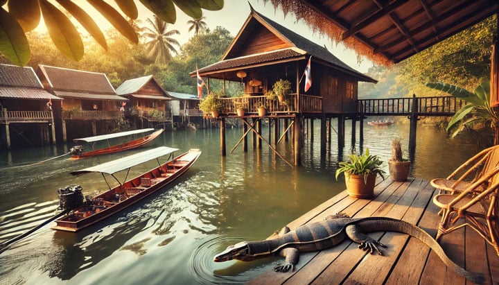We verbleven in een authentieke paalwoning aan de Mae Khlong, waar we vanaf onze vlonder konden genieten van de longtailboten die voorbij voeren en de varanen die langs zwommen.