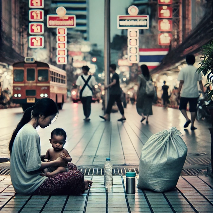 Uit het niets verscheen plotseling een uitgemergelde Thaise oude man met een baby in zijn armen. Voor ik kon reageren, bijvoorbeeld door een kleine donatie te geven, waren de man en de baby al verdwenen, opgeslokt door de lege straat. Dit beeld, en mijn gemis aan enige reactie, blijft me tot op de dag van vandaag bij.