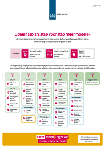 De 1e stap in het openingsplan is op zijn vroegst op 28 april 2021. Dan kunnen bijvoorbeeld de terrassen en winkels open. En wordt de avondklok afgeschaft. Dit wordt op 20 april besloten.