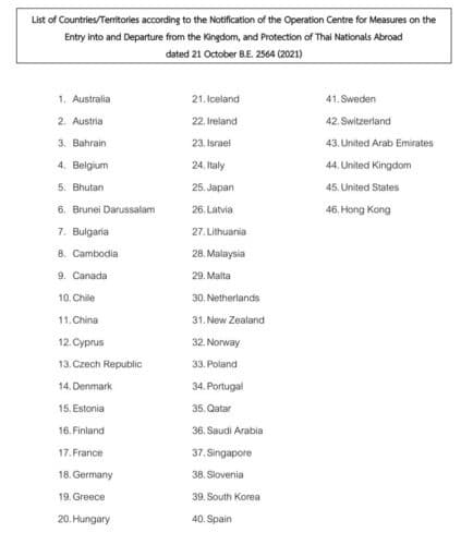 Bezoekers uit de 46 landen, beschreven als de eerste groep met een laag risico, mogen Thailand per vliegtuig binnenkomen zonder de verplichte quarantaine, op voorwaarde dat ze volledig zijn gevaccineerd en negatieve PCR-test kunnen overleggen. Ze moeten er ook mee instemmen om bij aankomst nog een test te doen.