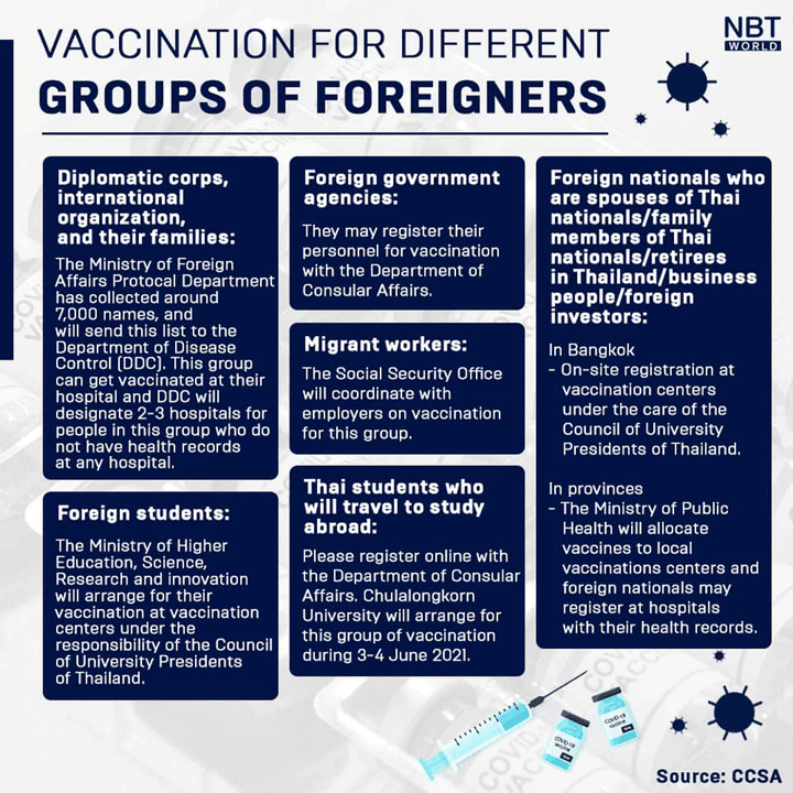 De aankondiging volgt op woede buitenlanders nadat het ministerie van Volksgezondheid op 4 mei had gezegd dat Thai voorgaan bij het vaccineren. Die mededeling is op 6 mei ingetrokken: Thaise en buitenlandse staatsburgers hebben gelijke toegang tot vaccinatie om zo groepsimmuniteit te bewerkstelligen.