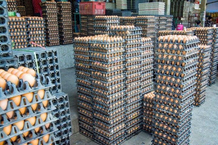 Ook eieren, voor veel gezinnen een onmisbare en relatief goedkope eiwitbron, zijn duurder geworden. Eieren van maat 3 stegen op 16 maart van 3,5 tot 3,6 baht per stuk naar 3,7 tot 3,8 baht. Dat lijkt weinig, maar per tray loopt het verschil op tot ongeveer 6 baht.