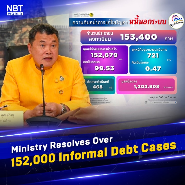 Het Ministerie van Binnenlandse Zaken heeft aanzienlijke vooruitgang geboekt bij het aanpakken van de informele schuldenproblematiek in het land. Er zijn inmiddels 152.679 gevallen van informele schulden succesvol opgelost, wat heeft geleid tot een totale schuldvermindering van 1,2 miljard baht.