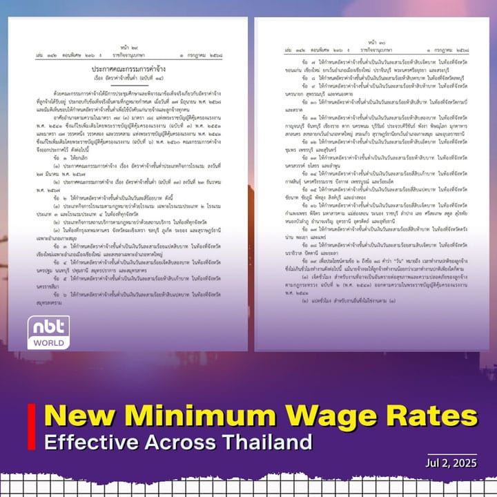 Op 1 juli 2025 is in Thailand een nieuw systeem van minimumlonen in werking getreden, na officiële publicatie in de Royal Gazette. De regeling, uitgevaardigd door de tripartiete looncommissie onder de titel Minimumloon nr. 14, is gebaseerd op een resolutie van 17 juni 2025 en geldt voor alle werkgevers en werknemers in het land.