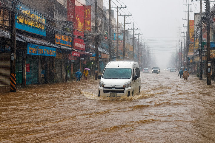 In het drukke hart van het district Muang stonden delen van belangrijke verkeersaders vrijdagochtend bijna twee kilometer onder water. Auto’s, motoren en busjes worstelden zich door een bruine stroom die tot aan de motorkap reikte. Winkeliers legden extra rijen zandzakken neer in een poging hun voorraden droog te houden.