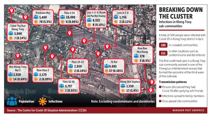 De Thaise overheid is versneld begonnen met het vaccineren en testen van de bewoners van de sloppenwijk Klong Toey in Bangkok. Gevreesd wordt dat het havenkwartier van de hoofdstad een super spreader hub wordt en dat de ziekenhuizen het aantal besmettingen niet aan kunnen.