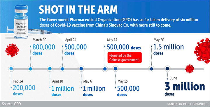 De Government Pharmaceutical Organization (GPO) heeft donderdag 1,5 miljoen extra doses Covid-19-vaccin ontvangen van het Chinese Sinovac Co. De GPO heeft sinds februari acht partijen van het Sinovac-vaccin ontvangen, voor een totaal van 6 miljoen doses. Sinovac zal in juni nog eens 3 miljoen doses leveren. De vaccins worden door de Chinese overheid geschonken aan Thailand.
