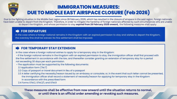 De Thaise immigratiedienst heeft daarom een tijdelijke regeling opengesteld voor buitenlandse reizigers die sinds 28 februari 2026 door de situatie in het Midden-Oosten niet kunnen vertrekken. Daarbij gaat het niet alleen om verlenging van verblijf, maar in bepaalde gevallen ook om soepelere omgang met overstay bij vertrek. Dat is belangrijk, want normaal lopen de boetes in Thailand snel op.