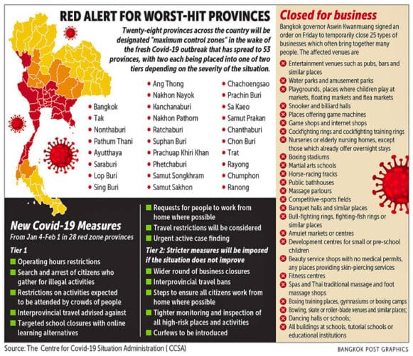 Het Centre for Covid-19 Situation Administration (CCSA) heeft in 28 provincies strengere maatregelen uitgevaardigd omdat daar het aantal besmettingen in hoog tempo stijgt. Ze zijn dan ook uitgeroepen tot red zone.