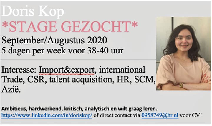 Mijn naam is Doris Kop, een International Business for Asia student aan de Hogeschool Rotterdam. Voor september 2020 ben ik op zoek naar een tof stagebedrijf, die een vestiging heeft in Azië.