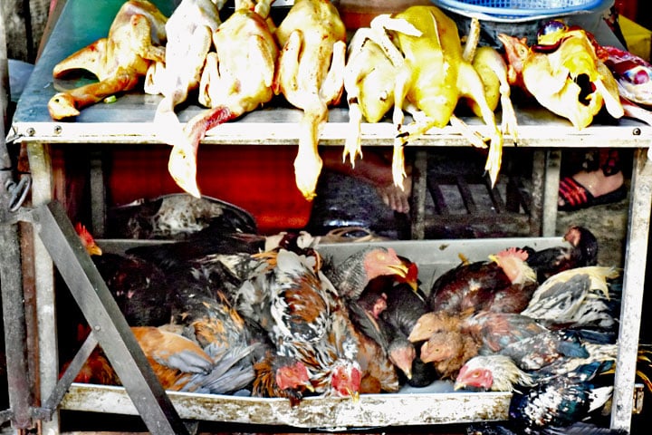 Een heel ander voorbeeld zijn de kippen die ik verleden maand op de markt in Phnom Penh aantrof. De geslachte kippen lagen voor de verkoop uitgestald en die waren wat je noemt kakelvers.