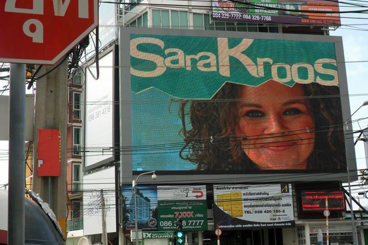 Wie in Pattaya op de Thepprasit richting T-kruising Thappraya Road rijdt, ziet op het eind een enorm Led Screen hangen. Wie bij de stoplichten staat te wachten, ziet wel dat het groot is, maar met de maten 14 meter bij 10 meter krijgt dat meer inhoud.