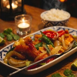 Koong pad prik sod is een vurig Thais roerbakgerecht. De naam vertaalt letterlijk naar ‘geroerbakte garnalen met verse chili’. Het onderscheidende kenmerk is het gebruik van verse chilipepers, wat zorgt voor een directe, frisse hitte in plaats van de smaak van chilipasta. Het gerecht wordt snel bereid in de wok met garnalen, knoflook, ui en een smaakvolle sausmix, en traditioneel geserveerd met rijst.