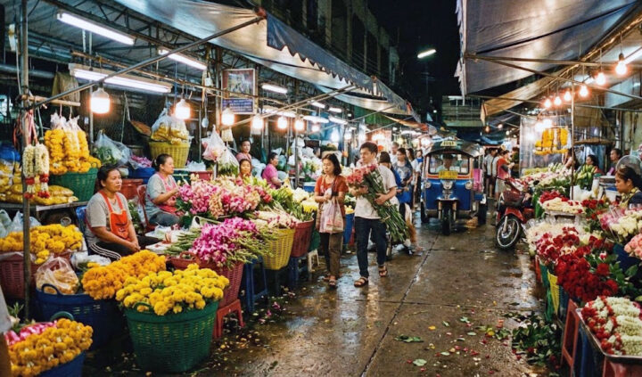 Wanneer de rest van Bangkok op één oor ligt, draait de Pak Khlong Talat op volle toeren. Tussen twee en vier uur ’s nachts is de chaos op zijn mooist. Vrachtwagens volgeladen met bloemen uit de koelere provincies zoals Chiang Mai en de nabijgelegen regio Nakhon Pathom rijden af en aan. De smalle gangpaden vullen zich met dragers die met duizelingwekkende snelheid manden vol bloemen verplaatsen. Het is een georganiseerde chaos die je nergens anders vindt.