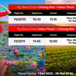 Vanaf 1 december 2025 start Thai AirAsia met een nieuwe binnenlandse verbinding tussen Chiang Mai en Udon Thani. De route, die vier keer per week wordt gevlogen, is de enige rechtstreekse vlucht tussen Noord-Thailand en het noordoosten (Isaan). Met ticketprijzen vanaf 999 baht wil AirAsia zowel Thaise reizigers als toeristen een snellere manier bieden om deze twee regio’s en buurland Laos te verbinden.