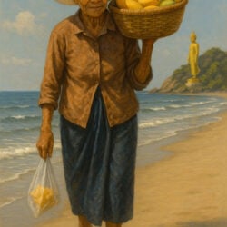 Aan het strand van Hua Hin ontmoet Reinout elke dag dezelfde fruitdame. Ze lijkt gewoon, tot een verloren sandaaltje, een droom en een ontmoeting bij de apenrots haar ware verhaal onthullen. Wat begint als een alledaags moment in de zon verandert in een beklemmende legende over verlies, liefde en rust vinden aan de rand van de zee.