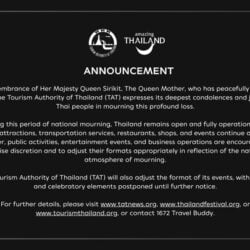 Na het overlijden van Hare Majesteit Koningin Sirikit, de koningin-moeder, heeft de Thaise regering een nationale rouwperiode afgekondigd. Overheidsinstellingen hangen de vlag halfstok en ambtenaren dragen een jaar lang rouwkleding. Burgers worden opgeroepen om negentig dagen ingetogen gekleed te gaan. Toerisme, evenementen en dagelijks leven blijven doorgaan, maar met aanpassingen in toon en uitstraling, passend bij de rouwperiode.