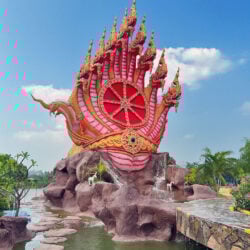 In Udon Thani staat een indrukwekkend beeld van een naga met negen koppen, dat een klein tempelcomplex omringt. Deze mythische slang, diep geworteld in het boeddhisme, kronkelt over een vijver naar een eiland waar een verborgen schrijn ligt.