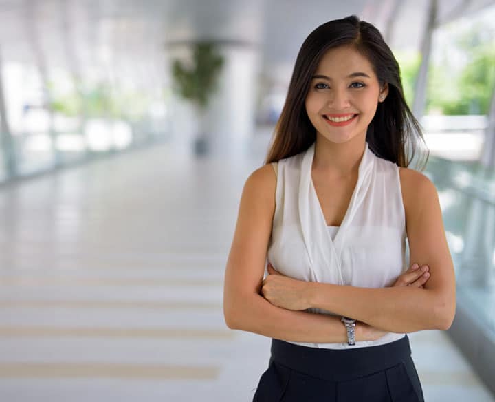 Een prachtige jonge vrouw, gekleed in smetteloos witte blouse en strakke zwarte rok.