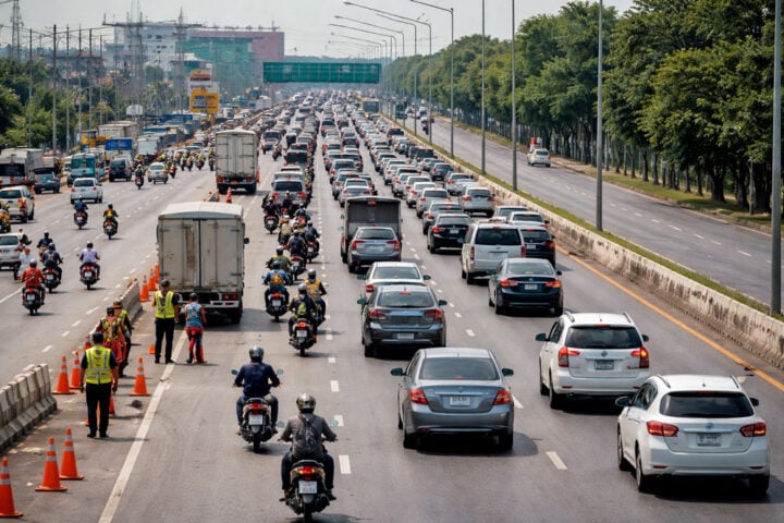 De laatste dag van de lange Songkran-vakantie verliep op veel wegen nog altijd druk. Op de Mittraphap Road tussen Khon Kaen en Nakhon Ratchasima bleef het verkeer donderdag zwaar, terwijl veel reizigers terugkeerden naar huis na de feestdagen.