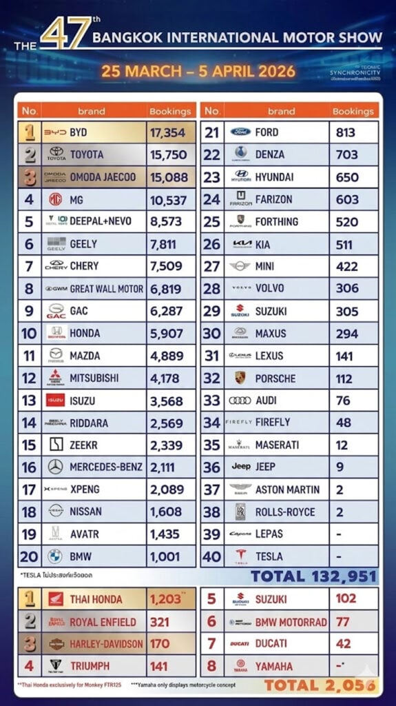 De 47e editie van de Bangkok International Motor Show eindigde op een uitzonderlijk hoog niveau. Naast 132.951 geboekte auto’s noteerde de organisatie ook 2056 motorboekingen. In totaal kwamen 1.798.312 bezoekers naar het evenement. Dat maakt duidelijk dat de beurs niet alleen een verkoopplatform is, maar ook een publieksmagneet van formaat.