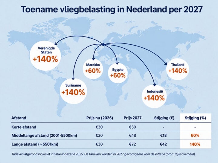 Vanaf 2027 betaal je als reiziger vanuit Nederland fors meer vliegbelasting. Het kabinet kiest voor een gedifferentieerd tarief, waarbij de afstand tot je eindbestemming bepalend wordt. Voor korte vluchten blijft het tarief gelijk, maar voor middellange en lange reizen stijgt de heffing stevig. Dat raakt niet alleen vakantievluchten binnen Europa, maar ook verre reizen naar Azië.