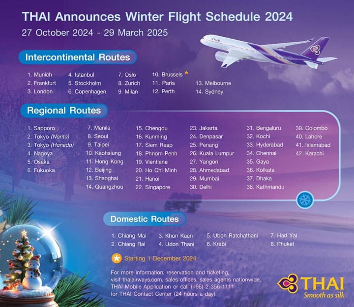 Thai Airways International (THAI) heeft woensdag aangekondigd dat het tijdens de winterdienstregeling van 27 oktober 2024 tot en met 29 maart 2025 vluchten zal uitvoeren naar 64 bestemmingen wereldwijd. Het aantal vluchten op bepaalde routes zal worden verhoogd om te voldoen aan de toenemende vraag.