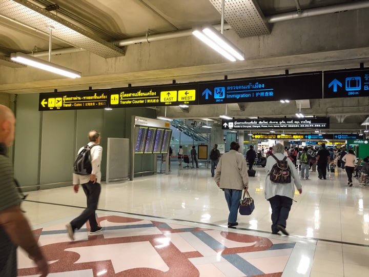 Na arrival in BKK gaat men door immigratie, haalt de bagage af en check vervolgens zelf in voor de verdere vlucht.