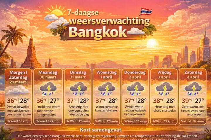 Aan de zuidkust blijven de temperaturen iets lager, maar nog altijd zomers, met maxima tussen 32 en 38 graden. Bangkok krijgt vanaf 29 maart te maken met warm weer, plaatselijke onweersbuien en windstoten, bij minima van 25 tot 27 graden en maxima van 34 tot 39 graden. Wie de komende week door Thailand reist, moet dus niet alleen naar de temperatuur kijken, maar ook naar lokale waarschuwingen.