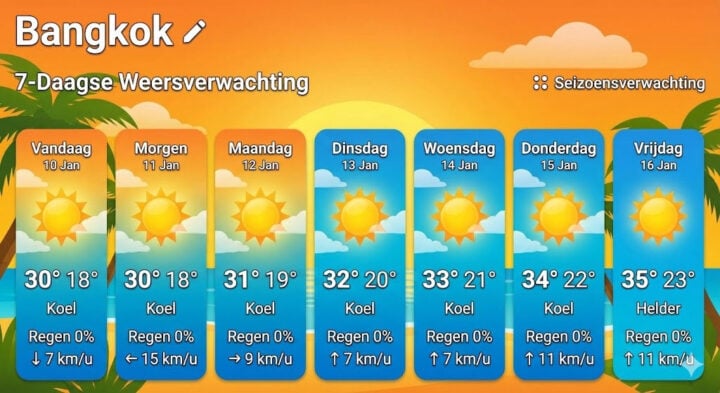 In Bangkok is het begin van de periode opvallend koel voor Thaise begrippen. Ochtenden starten fris, met temperaturen rond de 16 tot 18 graden. Later in de week loopt de temperatuur weer op richting 30 graden en meer. Ook hier kan mist het zicht in de vroege uren beperken.
