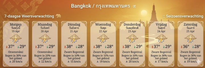 Thailand krijgt dus een week met grote weersverschillen, maar één lijn is duidelijk: hitte, onweersbuien en plotselinge rukwinden kunnen in veel regio’s tegelijk voor problemen zorgen. Of je nu in Bangkok bent, door Isaan reist of aan de kust verblijft, het is verstandig om het weer in de gaten te houden en voorzichtig te zijn.