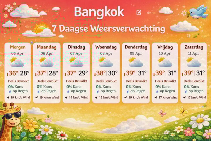 Thailand gaat dus een week tegemoet met zwaar zomerweer, afgewisseld door lokale buien en onstuimige wind. Reis je door het land of ben je veel buiten, dan is voorzichtig plannen verstandig. Vooral hitte, slechte lucht en snel omslaand weer kunnen het dagelijks leven flink beïnvloeden.